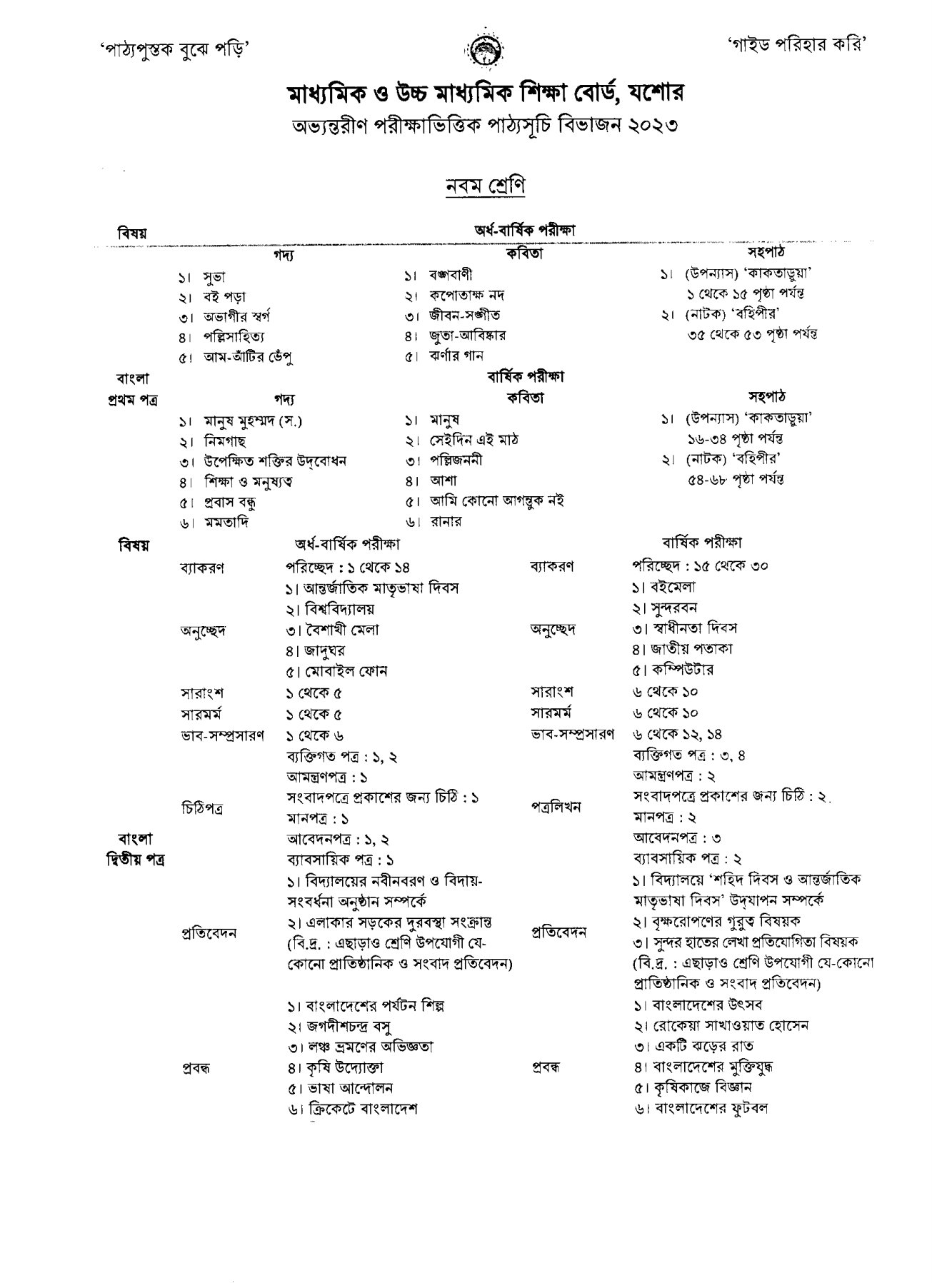 ১০ম /৯ম শ্রেণী সিলেবাস